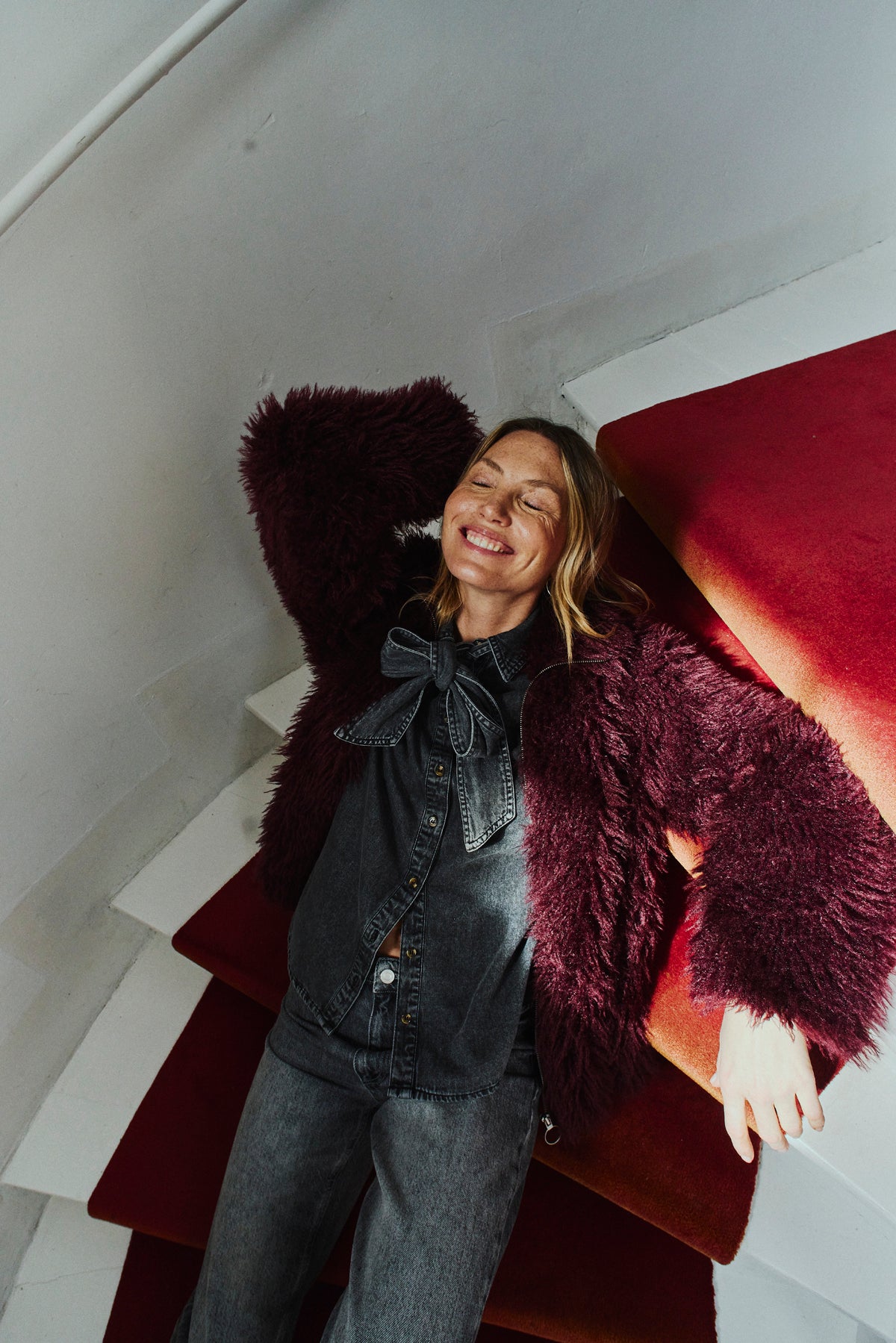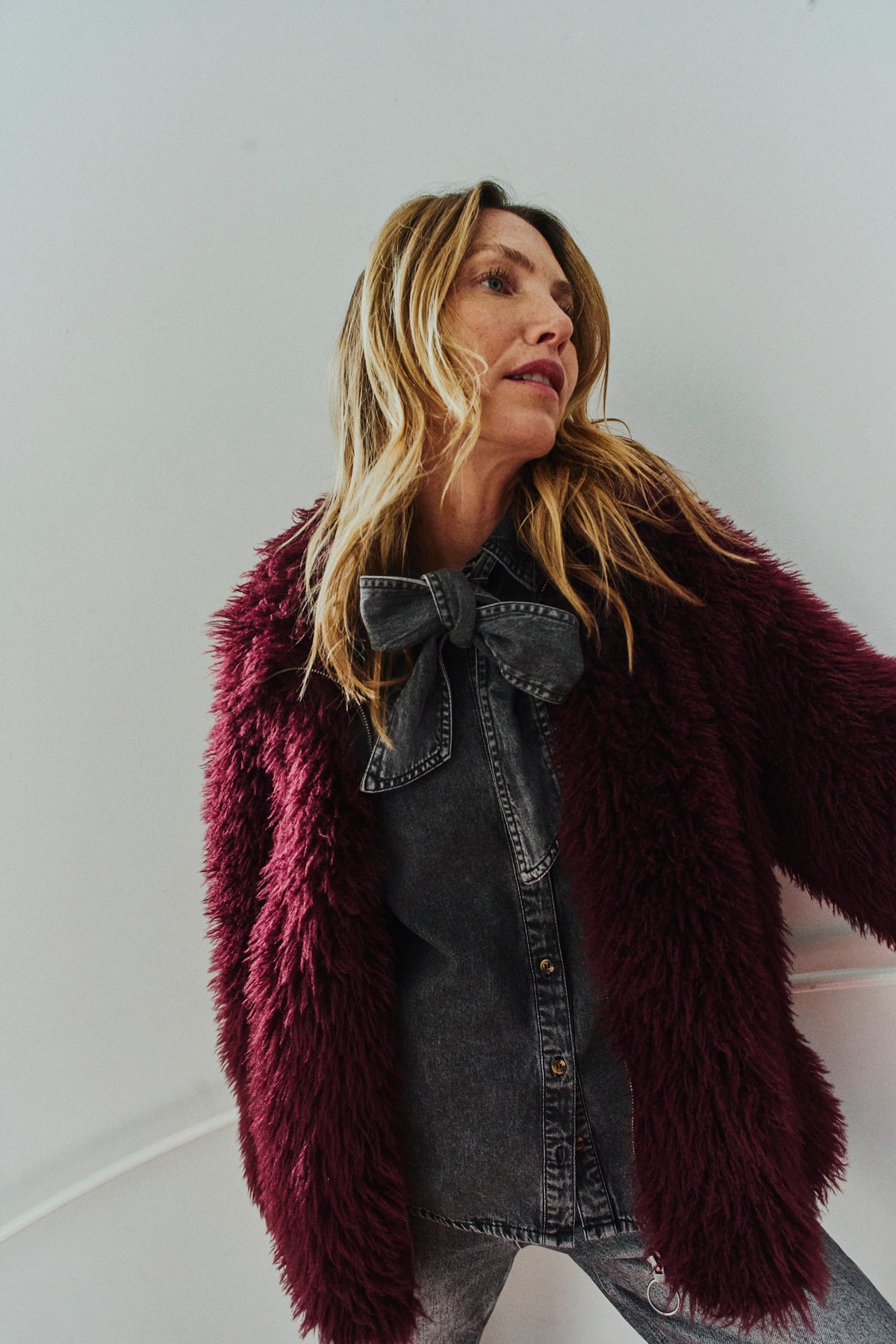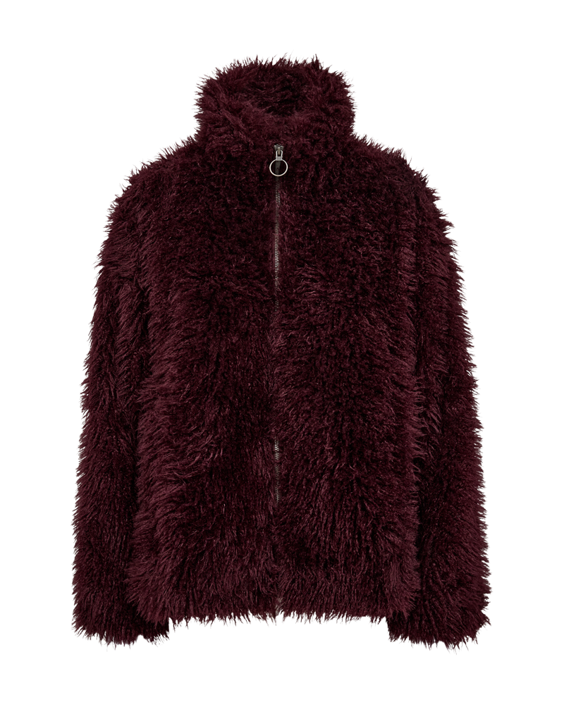 Geggjaður vínrauður loð jakki frá Free/Quent.